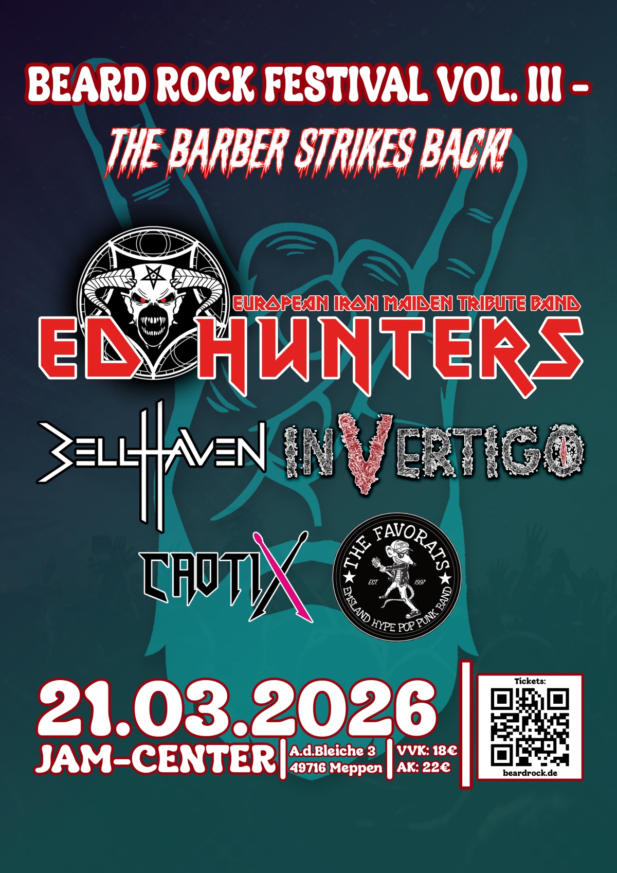 Im Headliner ED HUNTERS konnte eine der besten europäischen Iron-Maiden-Coverbands engagiert werden, die neben großen Hits und Spielfreude der Vorbilder auch das gigantische Drumset von Maidens Nicko McBrain auf der Bühne zeigen.
